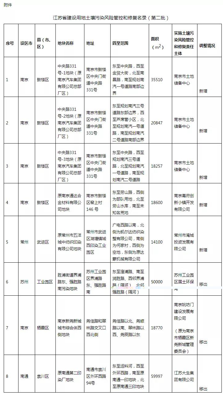 根據(jù)建設(shè)用地土壤污染風(fēng)險(xiǎn)評(píng)估情況,將南京市鼓樓區(qū)中央路331號(hào)-1地塊(原南京汽車集團(tuán)有限公司總部廠區(qū))等5個(gè)地塊新增列入名錄管理。